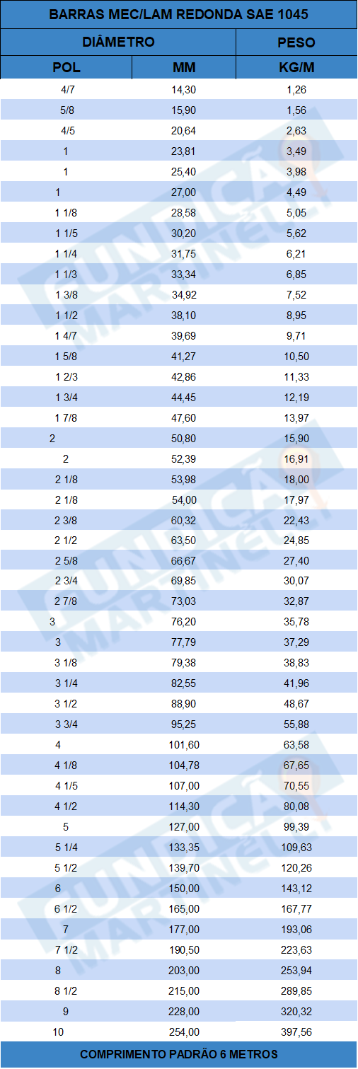 Segue a tabela de pesos e medidas das barras redondas em aço laminado.